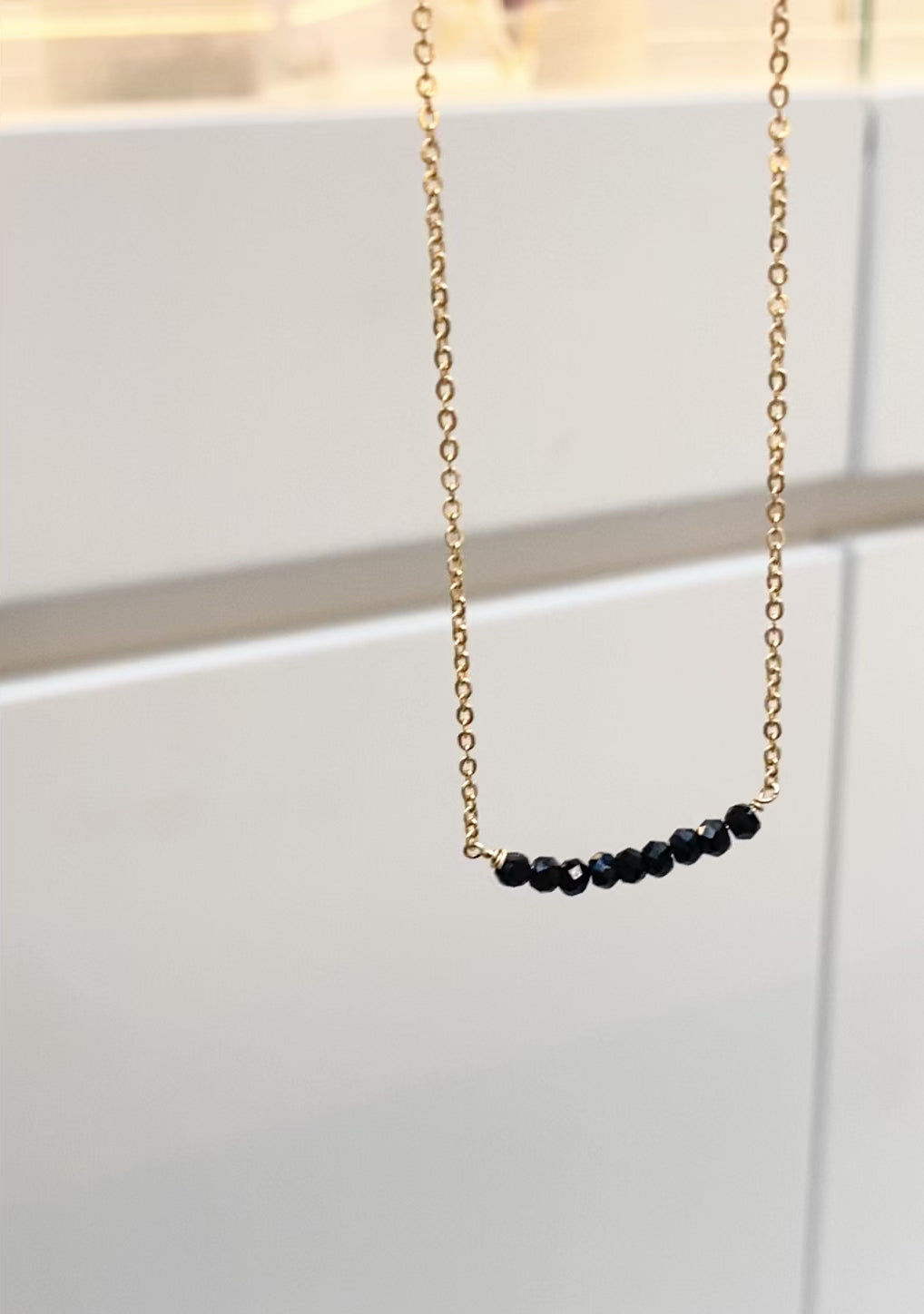 This necklace is designed to match our Black Onyx Swaggy Earrings perfectly. Black Onyx absorbs and transforms negative energy, and helps to prevent the drain of personal energy. Feature a five tiny black onyx gemstone fix in a gold filled chain.