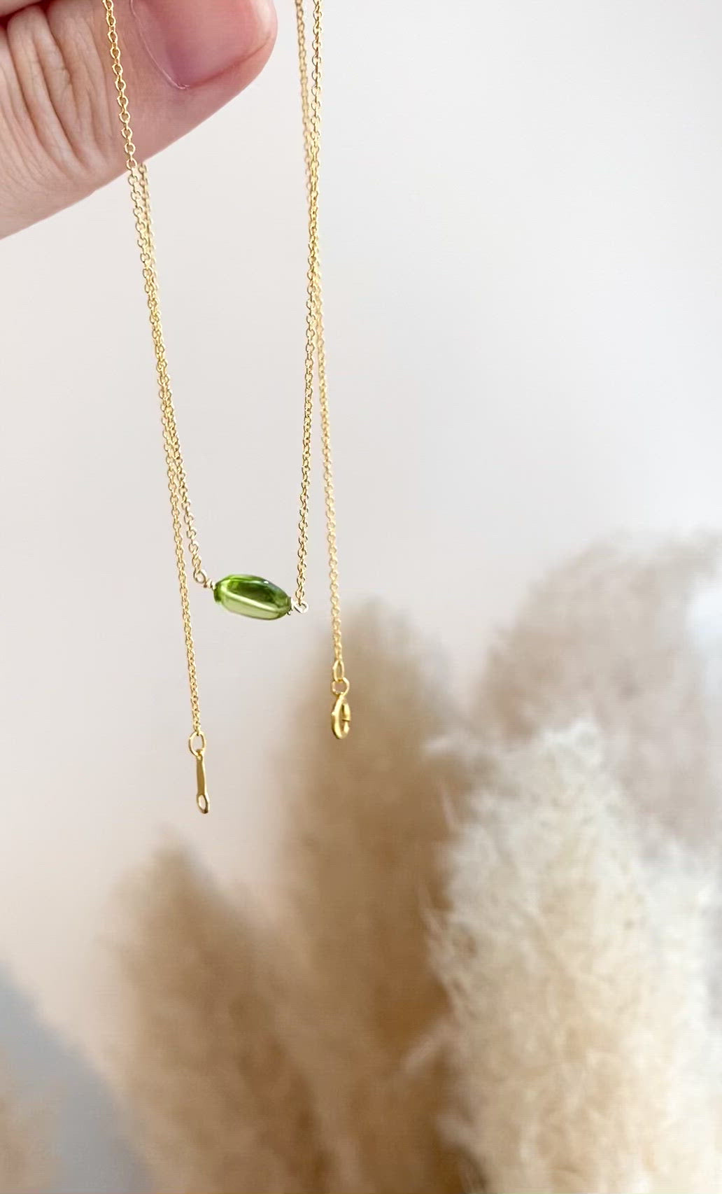 Birthstone of August. Peridot is a green color believed to bring good health, restful sleep and peace to relationships by balancing emotions and mind. Gold filled is used for our all findings that touches the skin to your piece lasts for years in its original splendor.